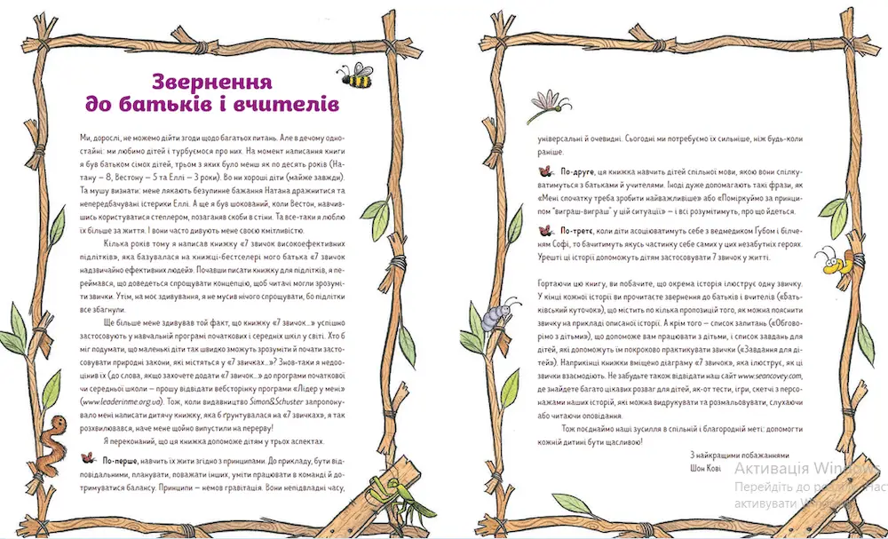 Шон Кові, автор бестселера «7 звичок високоефективних підлітків», у форматі казкових історій навчає теорії 7 звичок наймолодших читачів. Він переконаний, що ці оповіді навчать дітей жити згідно з природними принципами та озброять їх спільною із дорослими мовою.