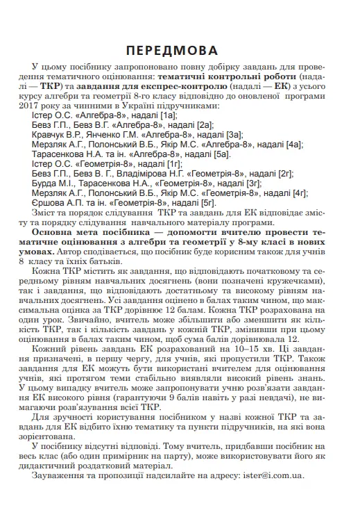 У посібнику запропонована добірка завдань для проведення тематичного оцінювання з алгебри і геометрії учнів 8-го класу. Тексти завдань складено відповідно до оновленої програми з математики 2017 року для загальноосвітніх навчальних закладів за чинними в Україні підручниками. Призначений для учнів загальноосвітніх середніх шкіл, гімназій, ліцеїв, для абітурієнтів, а також учителів і методистів.