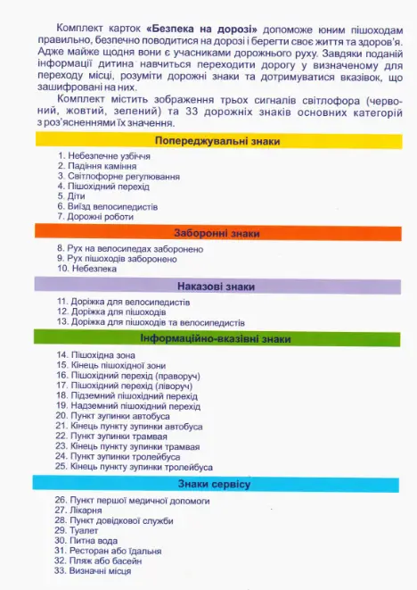 Комплект містить зображення трьох сигналів світлофора (червоний, жовтий, зелений) та 33 основні дорожні знаки з роз’ясненнями їх значення.
