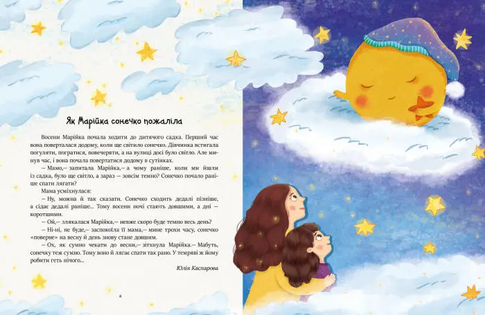 У книзі зібрані щонайдобріші історії, які стануть у пригоді саме для вечірнього читання. Казки короткі, кожну можна прочитати лише за п’ять хвилин. Це допоможе малюку дослухати історію до кінця й не втратити увагу.