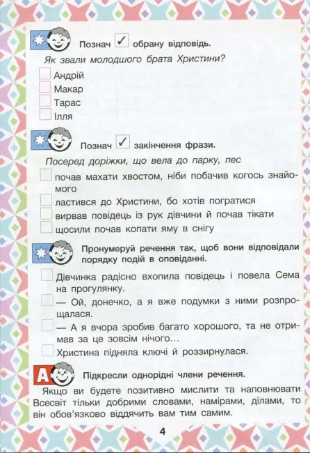 У посібнику вміщено тексти, які допоможуть дітям удосконалити навичку вдумливого читання, сприятимуть формуванню читацької грамотності, розвиватимуть уважність, емоційний інтелект і критичне мислення. До кожного тексту подано систему запитань різного рівня складності.
