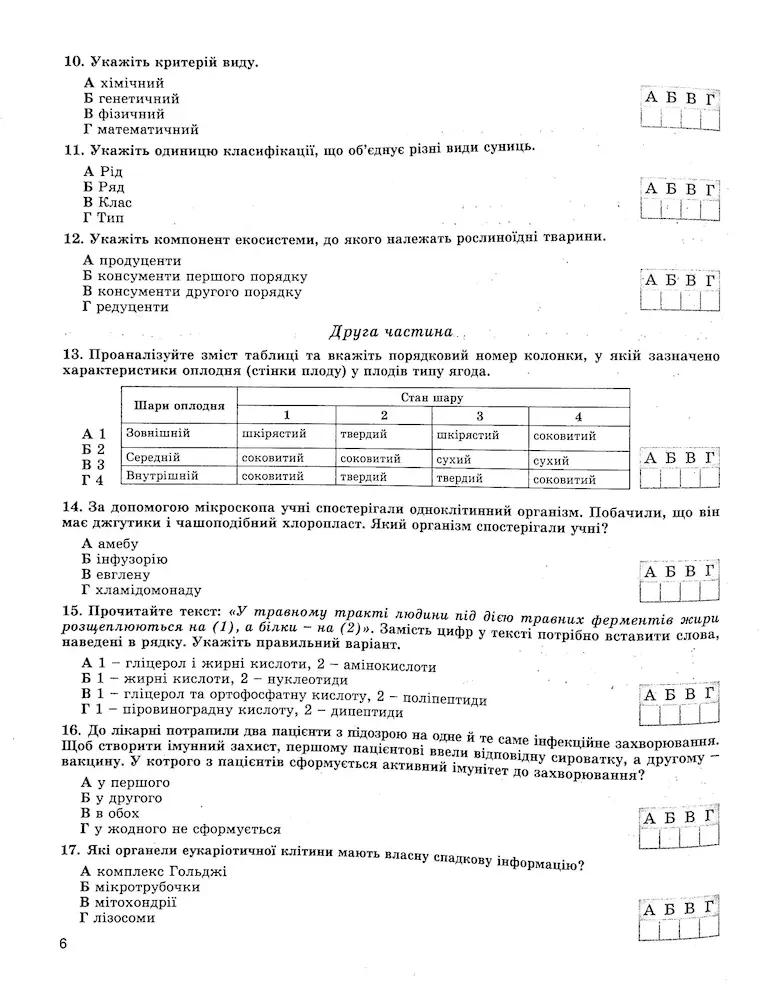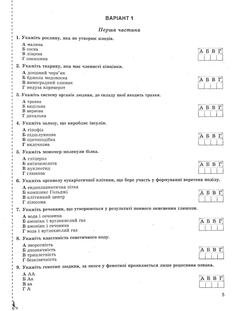 Збірник призначено для підготовки та проведення письмової державної підсумкової атестації за курс основної школи з біології в закладах загальної середньої освіти. Містить 10 варіантів атестаційних робіт. Кожен варіант складається з 27 тестових завдань різної форми: на вибір однієї правильної відповіді з чотирьох запропонованих; на встановлення відповідностей, на визначення правильної послідовності, завдання з розгорнутою відповіддю. Завдання кожного варіанту поділено на чотири частини за різними когнітивними рівнями, що відрізняються складністю. Завдання з розгорнутою відповіддю перевіряють уміння встановлювати причинно-наслідкові зв’язки, пояснювати взаємозв’язок будови та функції, порівнювати, узагальнювати, моделювати біологічні процеси.