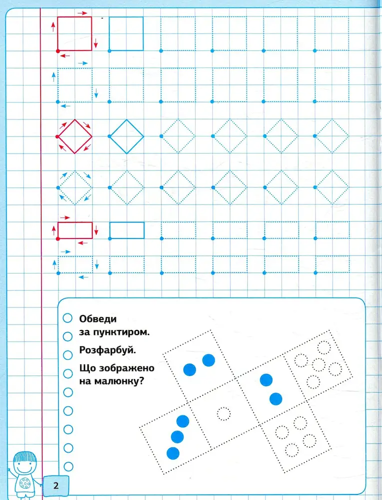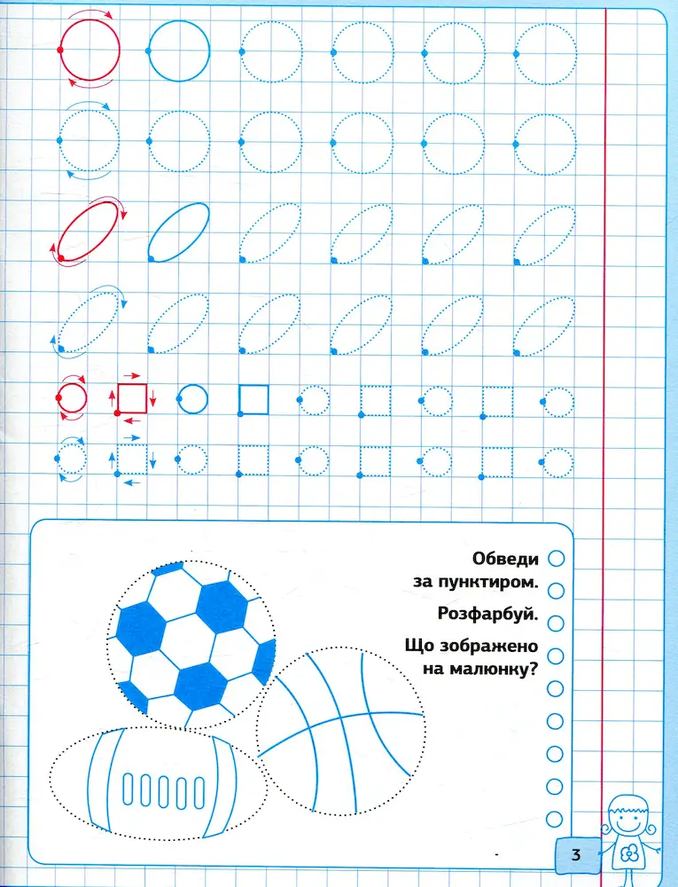 Виконуючи завдання з нашої книжки, дитина навчиться впевнено тримати олівець і ручку, підготується до письма.• Малюємо за зразком;• опановуємо писемні навички;• штрихуємо;• розфарбовуємо;• називаємо предмети.Регулярно навчаючись, дитина покращить пам’ять, увагу й уяву, збільшить свій словниковий запас і розвине мовлення, а також стане більш наполегливою та цілеспрямованою.