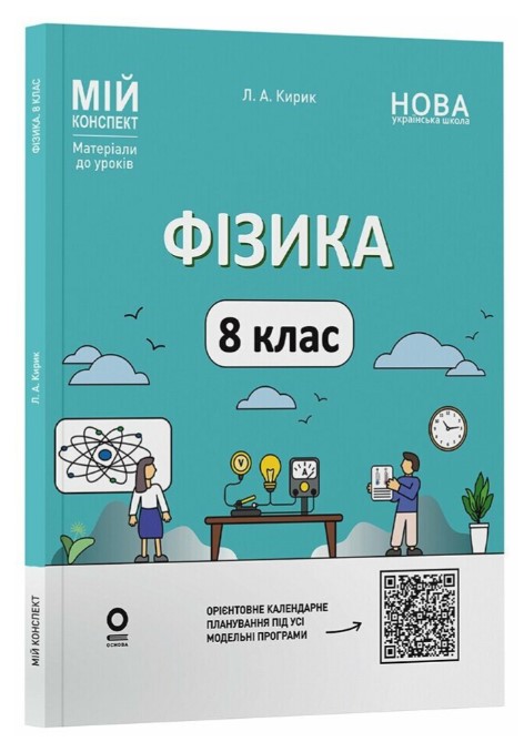 «Мій конспект» — серія №1 серед педагогів України! Пропонований посібник має на меті допомогти швидко та якісно, до уроків без стресу підготуватися до уроків фізики за Концепцією «Нова українська школа». Відповідає основним темам усіх модельних програм курсу «Фізика. 8 клас» (автори: Головко М. В., Засєкін Д. О. та ін.; Кремінський Б. Г., Гельфгат І. М. та ін.; Максимович З. Ю., Білик М. М. та ін.).