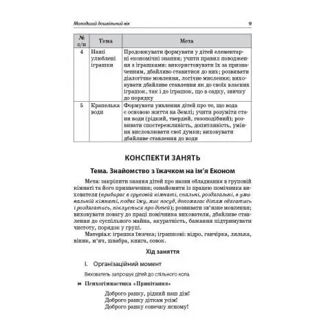 Орієнтовно перспективне планування та конспекти занять розподілені у відповідності до вікової групи вихованців: молодший дошкільний вік, середній дошкільн ий вік, старший дошкільний вік. Конспекти занять складено на навчальний рік за блочно-тематичним принципом планування та розроблено відповідно до вимог і завдань Базового компонента дошкільної освіти та чинних програм з урахуванням вікових психолого-фізіологічних особливостей дітей. Посібник буде корисним вихователям різних вікових груп, вихователям-методистам закладів дошкільної освіти, студентам відповідних факультетів вишів, батькам.