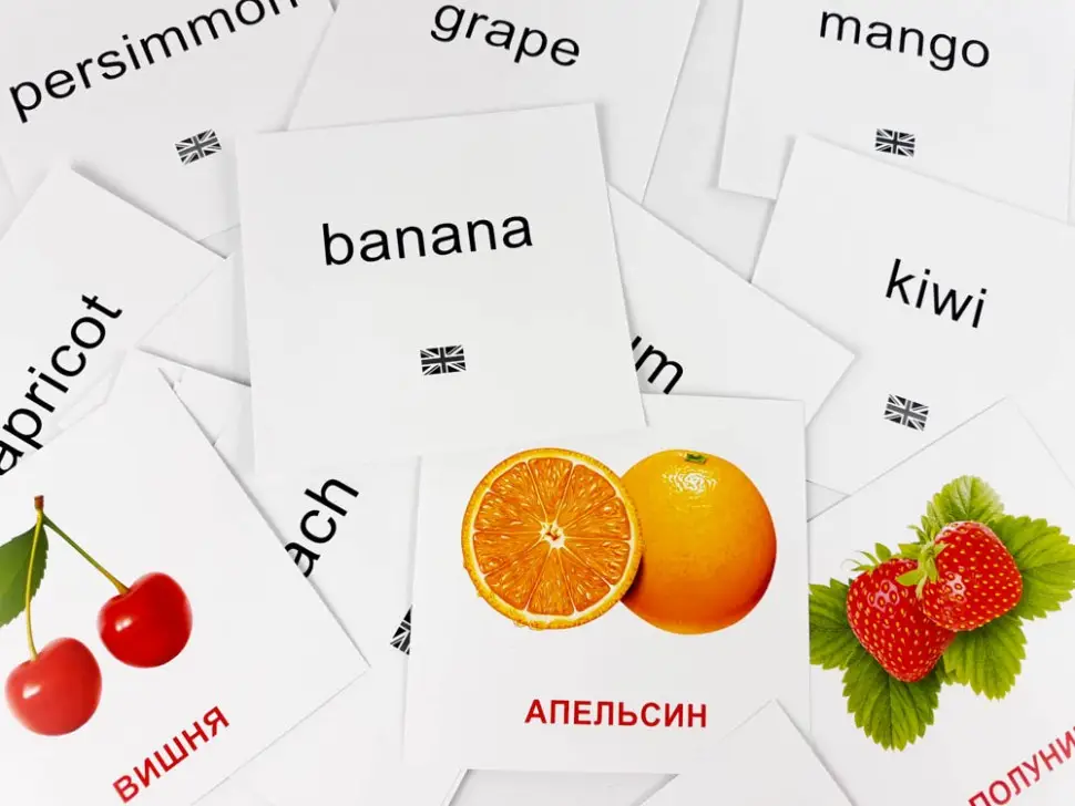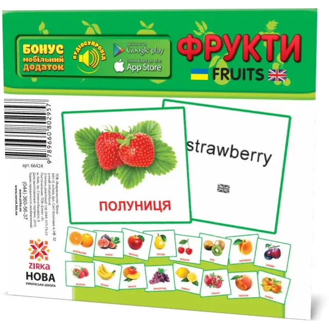 Тематичний комплект картонних карток із зображенням фруктів та їх назв для всіх, хто вивчає англійську мову. За допомогою додатку можна почути, як вимовляються назви зображених об’єктів українською та англійською мовами.