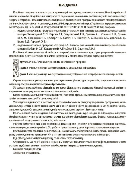 Усі діагностувальні роботи з усіх тем курсу «Географія. 8 клас» в одному посібнику! Посібник підготовлений відповідно до вимог нового Державного стандарту базової загальної середньої освіти, Типової освітньої програми для 5–9-х класів закладів загальної середньої освіти, змісту всіх чинних модельних навчальних програм курсу «Географія» для 8-го класу для закладів загальної середньої освіти (автори: Кобернік С. Г., Коваленко Р. Р. та ін.; Запотоцький С. П., Карпюк Г. І. та ін.), рекомендованих Міністерством освіти і науки України.