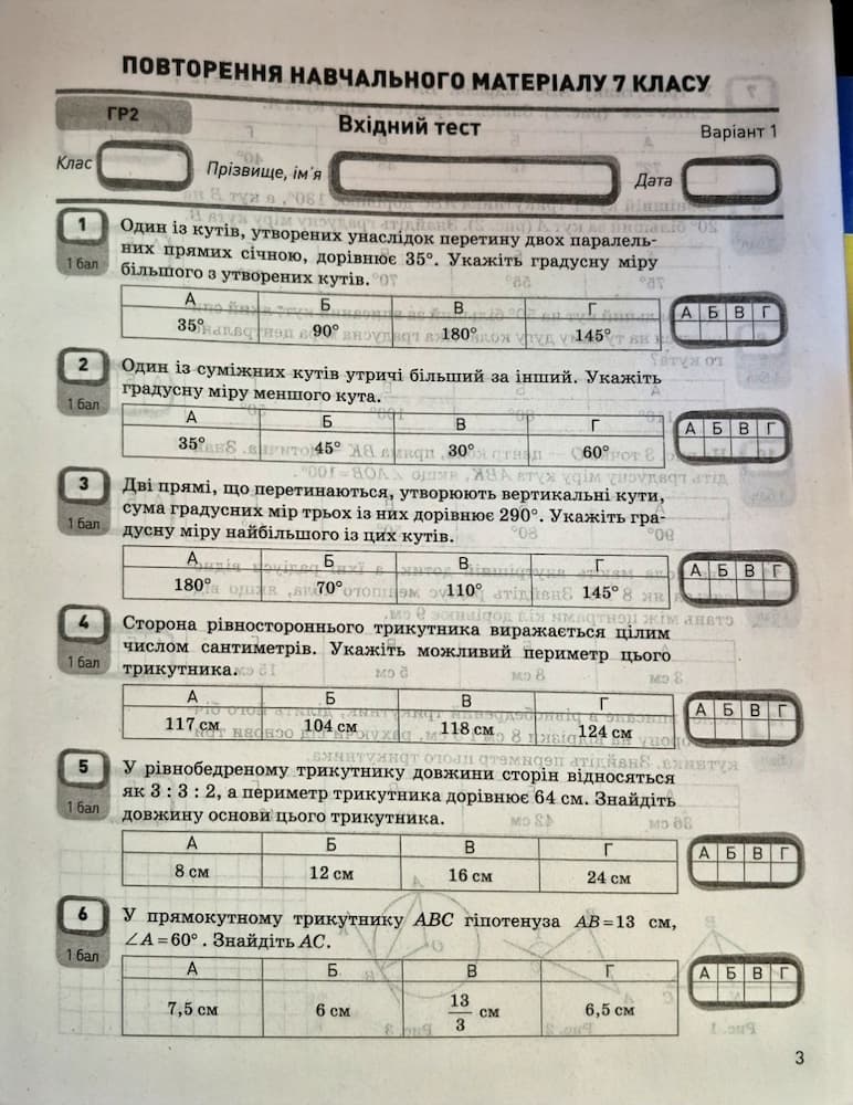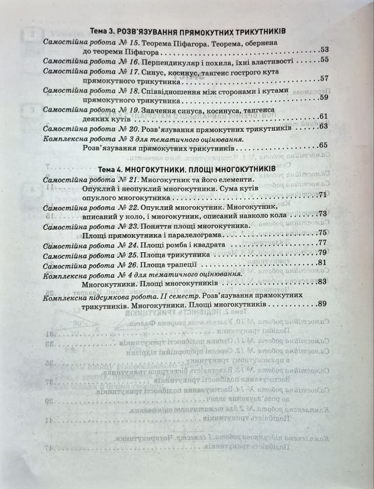 Видання містить вхідний тест, самостійні роботи, комплек- сні роботи для тематичного оцінювання та комплексні підсум- кові (семестрові) роботи у двох рівноцінних варіантах, складені відповідно до критеріїв оцінювання за групами результатів на- вчання для математичної освітньої галузі, тому може бути ви користаний в освітньому процесі за будь-якою прийнятою за- кладом освіти моделлю оцінювання. У посібнику передбачено бальне оцінювання, але запропоновані роботи можуть бути ви- користані також для формувального оцінювання, тобто без оцінювання в балах,у Е-додатку вміщено рекомендації щодо опінювання: крите рії оцінювання за групами результатів; додаткові завдання під вищеної складності.