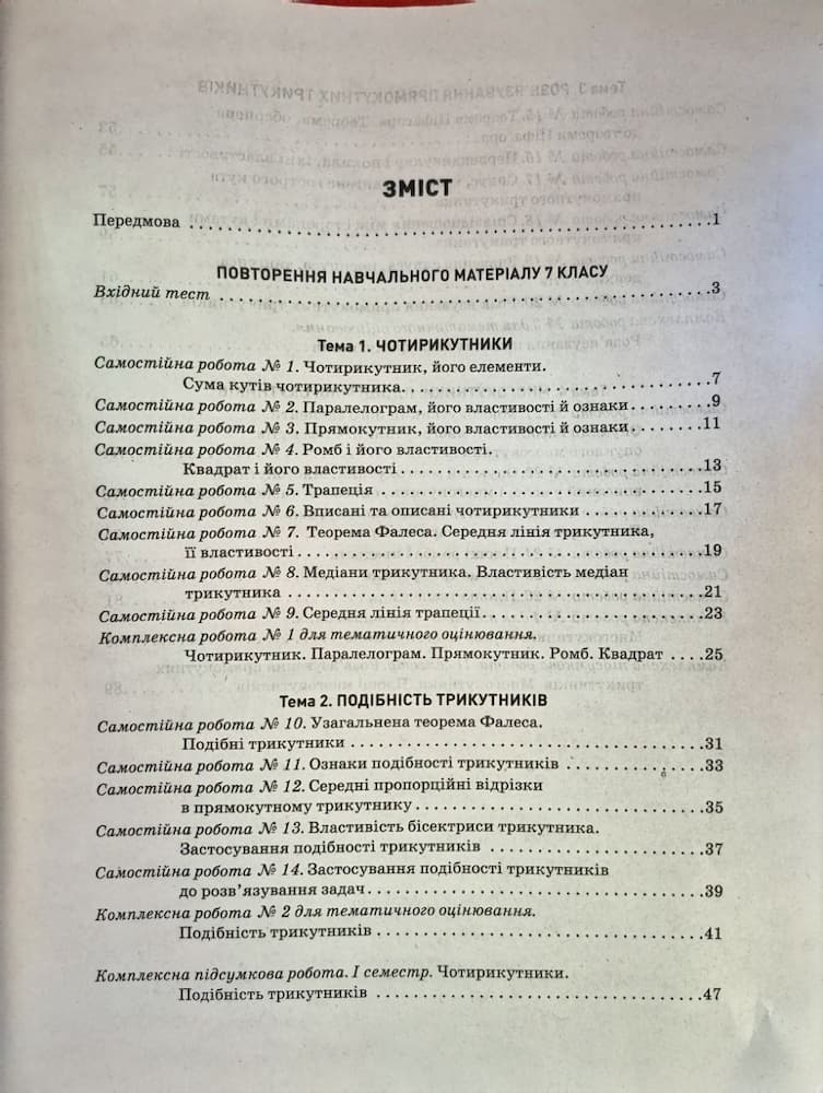 Посібник укладено відповідно до модельної навчальної про- грами «Геометрія. 7-9 класи» для закладів загальної середньої освіти (автор Істер О. С.) і призначено для організації форму- вального, поточного, тематичного й підсумкового оцінювання результатів навчання учнів ј учениць 8 класу з геометрії.