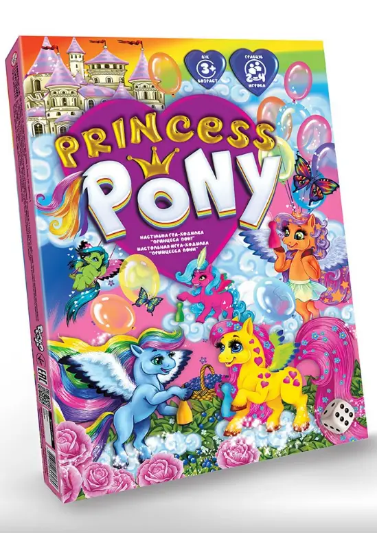 Кидаючи кубик і пересуваючись кольоровим полем гри “Принцеса поні”, гравці поступово наближаються до перемоги. Дорогою на них чекають захоплюючі пригоди й несподівані повороти подій – іноді навіть доведеться пропустити хід або повернутися на кілька кроків назад.