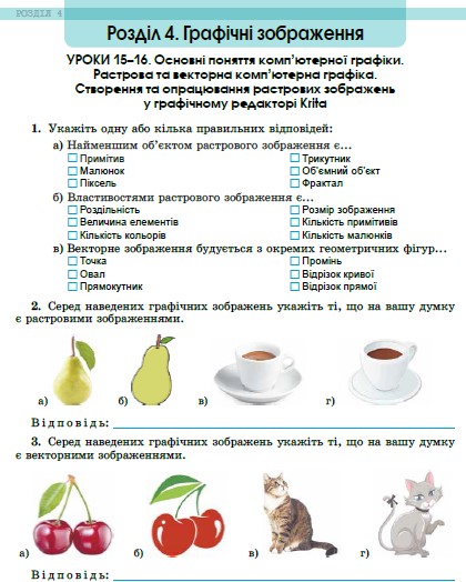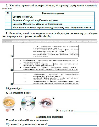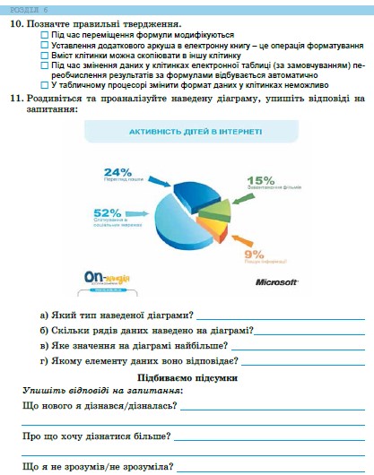 Крім того, до уроків наводяться запитання для рефлексії учнів і учениць. Вони мають на меті визначити, наскільки після вивчення навчального матеріалу справдилися сподівання учнів/учениць, а також яких результатів відповідно до Державного стандарту, з точки зору учня/учениці, він/вона досягли.