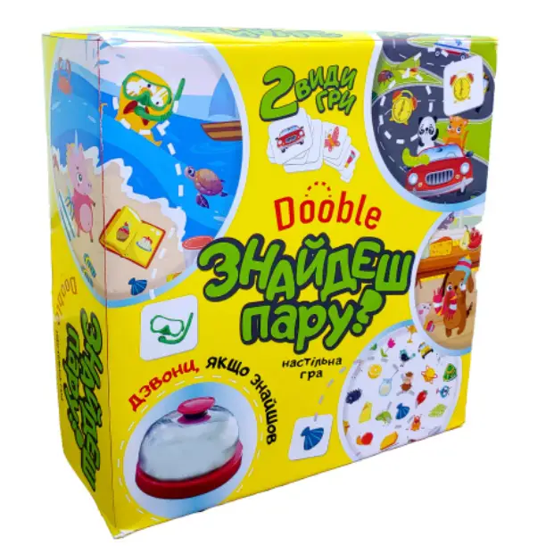 «Знайдеш пару?» – це гра, що залучає дітей до веселого дозвілля. Вона підходить компанії до 4 людей і допомагає активно провести час. Гра складається з двох видів ігрового поля і фішок. Завдання гравців знаходити на полі швидше за інших пари до малюнків з карток, таким чином збираючи їх у колекцію. І той, хто збере більше – переможець. Гра «Знайдеш пару?» сприяє розвитку уважності, швидкої реакції та комунікабельності. А ще, ця весела гра сподобається не тільки дітям, а й батькам. Вік: 4+. Гравців: 2-4 Час гри: 20 хвилин Комплектація: двостороннє поле, 96 карток, дзвоник, правила.