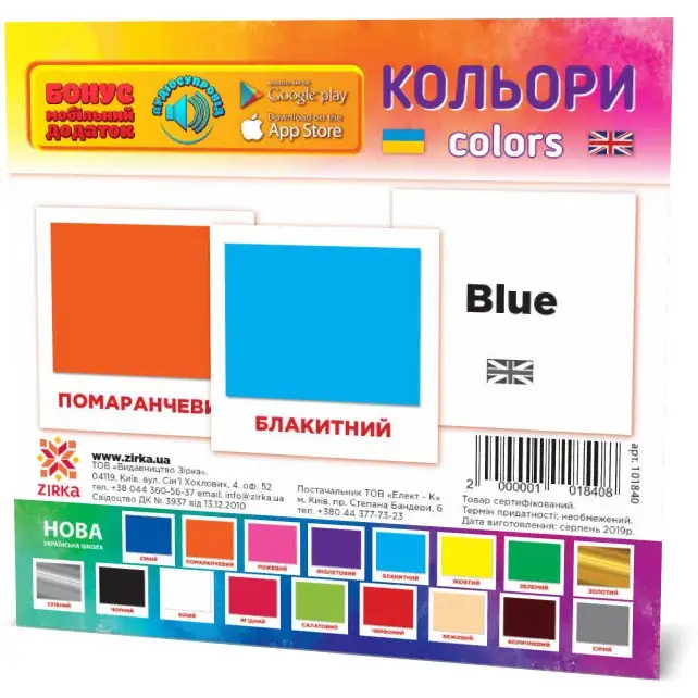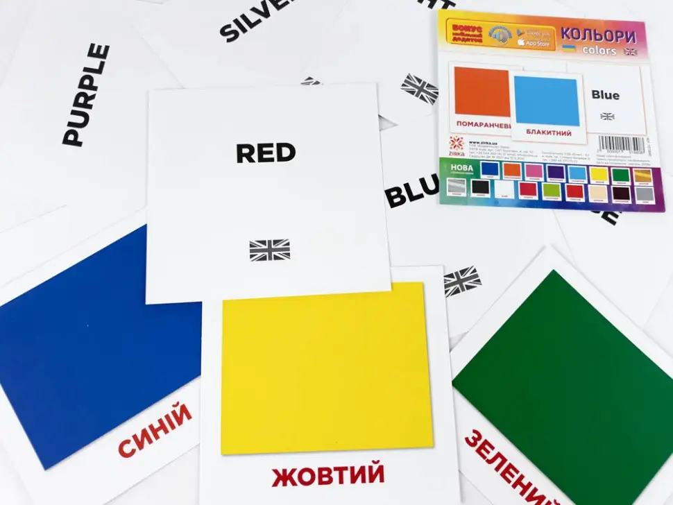 Комплект картонних карток із зображенням кольорів та їх назв для всіх, хто вивчає англійську мову. За допомогою додатку можна почути, як вимовляються назви зображених об’єктів двома мовами.