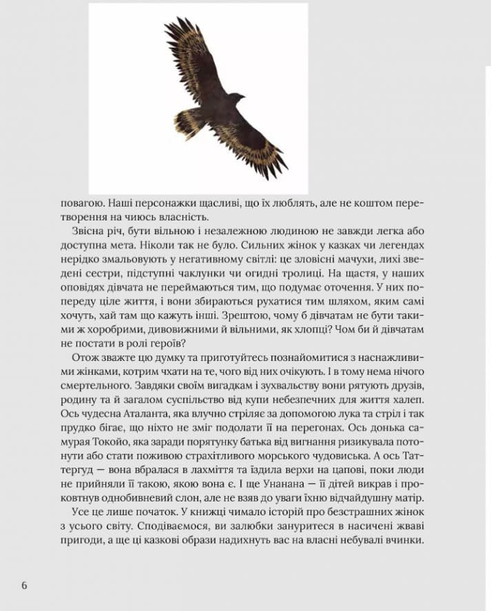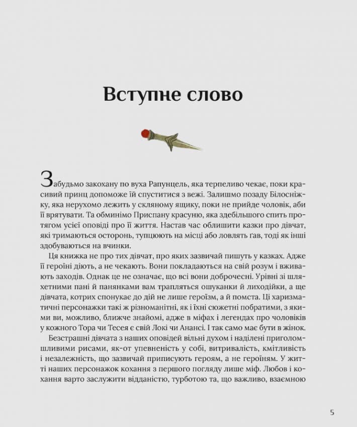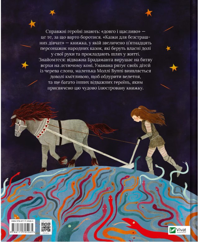 Справжні героїні знають: «довго і щасливо» — це те, за що варто боротися. «Казки для відважних дівчат» — книжка, у якій звеличено п’ятнадцять персонажок народних казок, які беруть власні долі у свої руки та прокладають свій шлях у житті. Знайомтеся: відважна Брадаманта вирушає на битву верхи на летючому коні, Унанана рятує своїх дітей із черева слона, маленька Моллі Вуппі виявляється доволі кмітливою, щоб обдурити велетня, та ще багато інших відважних героїнь, яким присвячено цю чудово ілюстровану книжку.