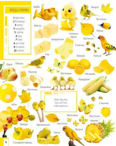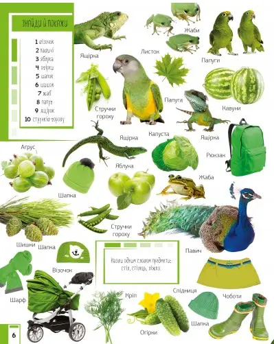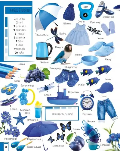 Ви тримаєте в руках унiкальну книжку, яка познайомить ваше маля з основними кольорами. Яскравi картинки зможуть утримати увагу маленького читача й сприятимуть розвитку його уяви. Малюк навчиться розпiзнавати й називати предмети, тварин, рослини, а також опанує лiчбу до десяти. Адже на кожному розворотi завдання знайти й показати певну кiлькiсть предметiв.