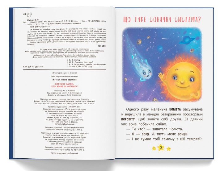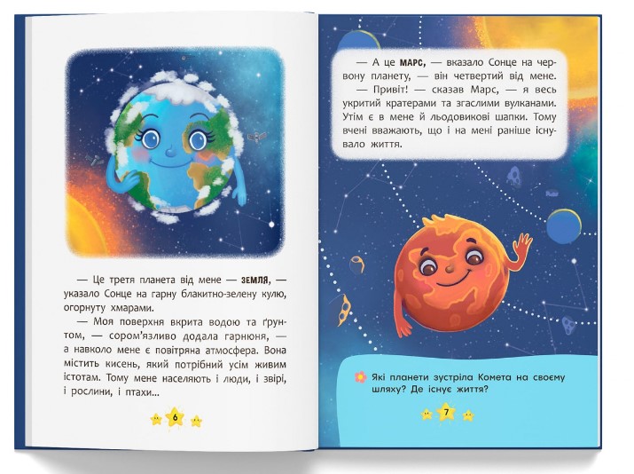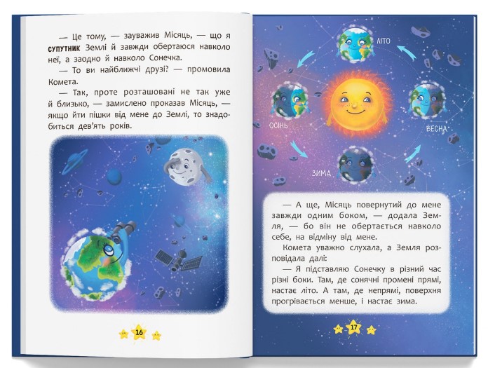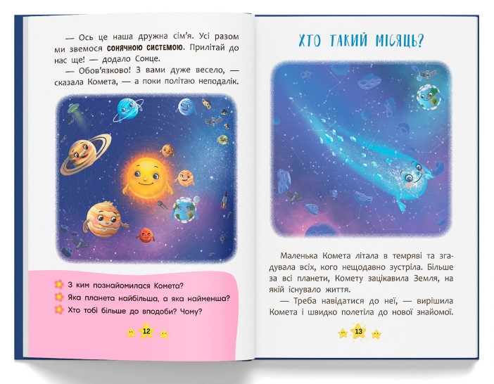 Ця книжка не звичайна, вона повчальна. Ми розповімо тобі чарівні космічні історії про наш Всесвіт та маленьку мандрівницю Комету, якій дуже кортіло знайти собі друзів та зрозуміти, що ж таке той космос. Під час захопливої подорожі Всесвітом Комета познайомилася із Сонцем та планетами Сонячної системи, затоваришувала із Землею та її вірним супутником Місяцем, зустріла безліч нових знайомих — астероїди, метеороїди, зірки та навіть чорну діру. Розгортай книжку, читай про пригоди маленької Комети й пізнавай наш Всесвіт разом з нею!
