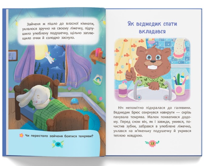 «Казочки для засинання» написані спеціально для читання перед сном. Малюк дізнається, як зайченя перестало боятися темряви, що обов’язково слід зробити перед сном та як сплять різні тваринки. Казки із чарівними ілюстраціями та затишними сюжетами допоможуть малюку розслабитися та зануритися у міцний сон.