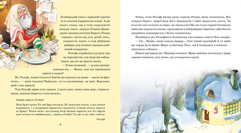 Настала зима, і всі радіють сніжку. До Різдва лишилися лічені дні, але зайчик Ралфі сумує. Що ж заважає маляті радіти прийдешньому святу? Виявляється, усі його друзі впали в зимову сплячку. А як можна радіти наодинці? Проте всім відомо: на Різдво здійснюються всі найпотаємніші мрії!.. Навіть зайчикові. Тож швидше розгорніть цю чарівну книжечку й вирушайте в казкову подорож разом із Ралфі й Королем Різдва