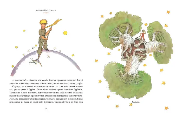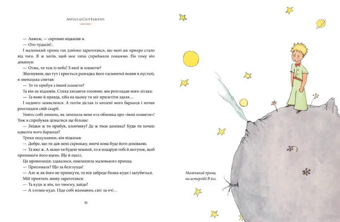 Ця книжка — справжній шедевр видатного французького письменника, поета й мислителя, пілота і вченого, конструктора й винахідника, людини-легенди Антуана де Сент-Екзюпері (1900–1944), якого один із його вчителів назвав «воістину універсальним талантом». Це захоплива лірична казка з цікавою фабулою для дітей і глибинним філософським змістом для дорослих, бо йдеться в ній про вічні категорії — добро і милосердя, чистоту і безпосередність, зачарований погляд на світ і любов до ближнього. «Добре бачить лише серце. Найголовнішого не побачити очима», — цю істину письменник стверджує своїм останнім закінченим твором, що його він сам просто і вишукано ілюстрував. Чудова книжка — на всі часи.
