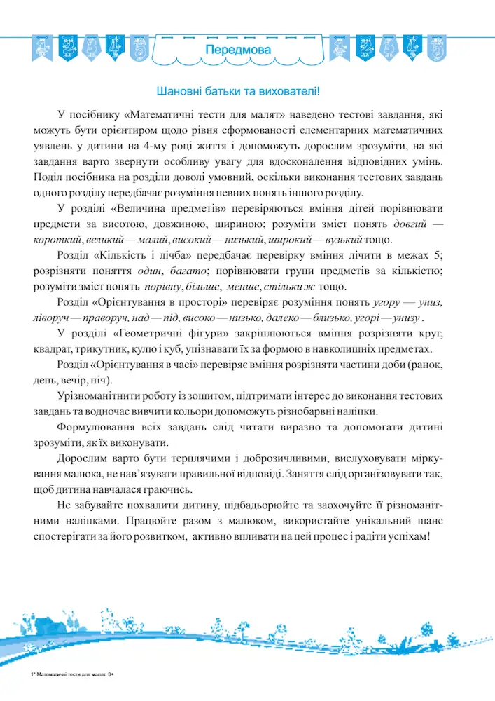 Пропонований посібник містить тестові завдання, які перевіряють рівень володіння дітьми 4-го року життя елементарними математичними уявленнями (форма, величина, просторові ознаки, лічба в межах 5), уміння аналізувати, порівнювати, узагальнювати, логічно міркувати.