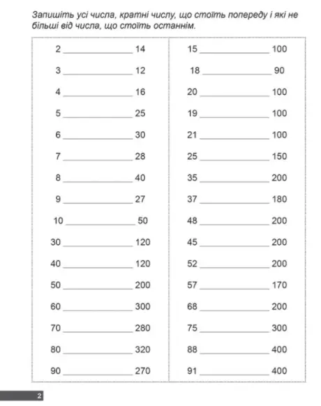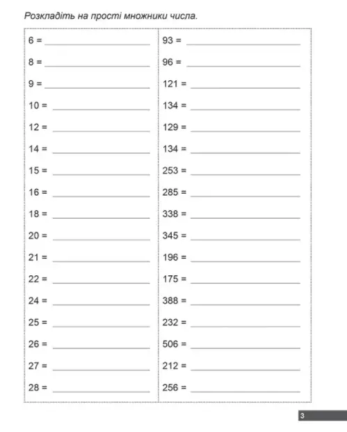 Мета цього тренувального зошита – навчити школяра розкладати натуральні числа на прості множники, знаходити НСК та НСД чисел, а також здійснювати арифметичні дії зі звичайними дробами, і все це робити швидко і насамперед правильно. Завдання розміщені з поступовим ускладненням, тренування треба проводити без перевантажень. Видання укладено відповідно до чинної програми з математики й ідеально підходить для самостійної роботи учня.