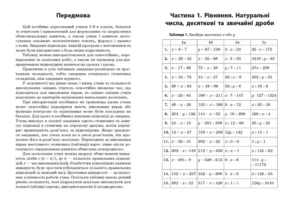 Посібник адресований учням 5-6-х класів, батькам та вчителям і призначений для формування та закріплення обчислювальних навичок, а також умінь і навичок застосування основних математичних понять, формул і правил з теми «Рівняння». Видання відповідає чинній програмі з математики та може бути використане з будь-яким підручником.