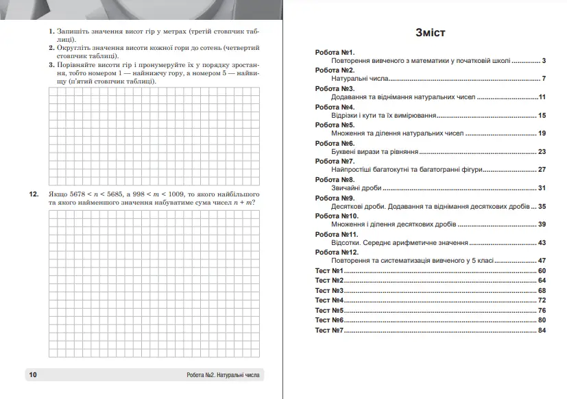 Зошит укладено відповідно до Державного стандарту базової середньої освіти, модельних навчальних програм Нової української школи та чинних підручників з математики для 5 класу (1. авт. Істер О.С.; 2. авт. Мерзляк А.Г., Полонський В.Б., Якір М.С.; 3. авт. Тарасенкова Н.А. та ін.; 4. авт. Бевз Г.П. та ін.; 5. авт. Кравчук В.Р., Янченко Г.М.; 6. авт. Джон Ендрю Біос; 7. авт. Скворцова С.О.; 8. авт. Беденко М.В., Клочко І.Я., Кордиш Т.Г.; Тадеєв В.О.), затверджених Міністерством освіти і науки України. Запропоновано 12 діагностичних та 7 тестових робіт. Посібник призначений для проведення діагностики засвоєння виучуваного матеріалу. Для учнів та учениць 5 класу, учителів математики, батьків.
