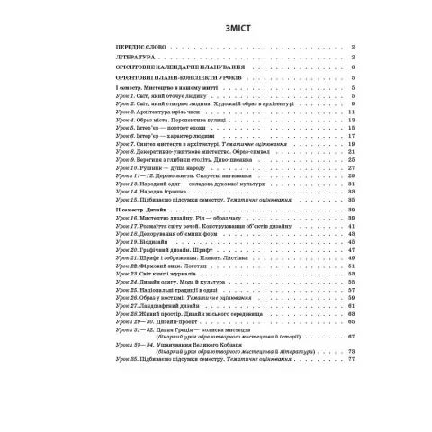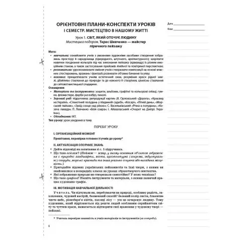 Посібник складено за підручником Л. В. Папіш, М. М. Шутка «Образотворче мистецтво. 7 клас», що рекомендований Міністерством освіти України для використання у навчально-виховному процесі. Орієнтовні календарне планування та плани-конспекти 35 уроків на відривних аркушах з полями для нотаток допоможуть учителеві скласти власні поурочні плани, доповнивши запропоновані у цьому виданні форми й методи роботи власними напрацюваннями з урахуванням навчальних досягнень учнів конкретного класу. Для вчителів образотворчого мистецтва загальноосвітніх навчальних закладів.