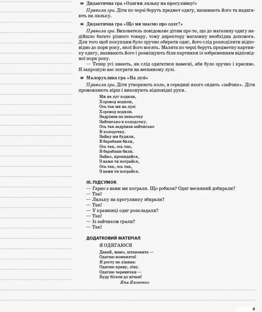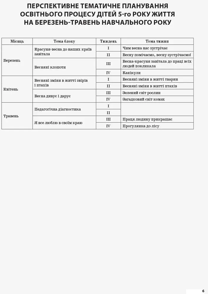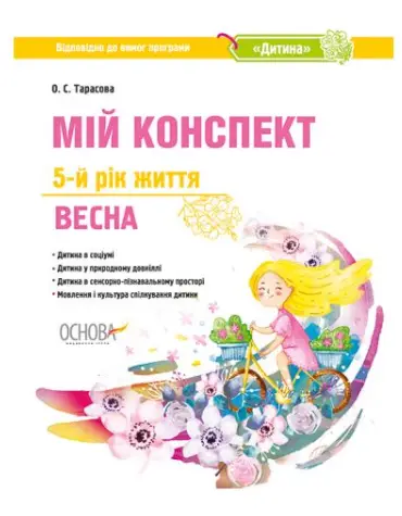 Посібник містить орієнтовні конспекти занять з дітьми 5-го року життя. Конспекти занять складено на навчальний рік (за порами року) за блочно-тематичним принципом планування та розроблено відповідно до вимог і завдань Базового компонента дошкільної освіти, освітньої програми розвитку дітей від 2 до 7 років “Дитина”. Задля зручності використання розробки кожного заняття розміщено на окремих аркушах. Береги для записів дадуть змогу творчому вихователеві, користуючись запропонованим у посібнику м атеріалом, скласти власні конспекти занять. Посібник буде корисним вихователям дітей п’ятого року життя, вихователям-методистам закладів дошкільної освіти.
