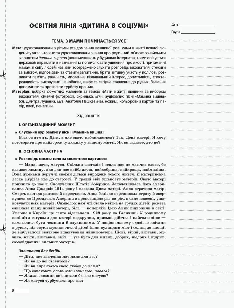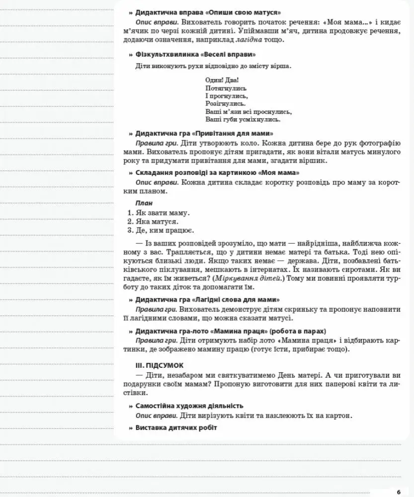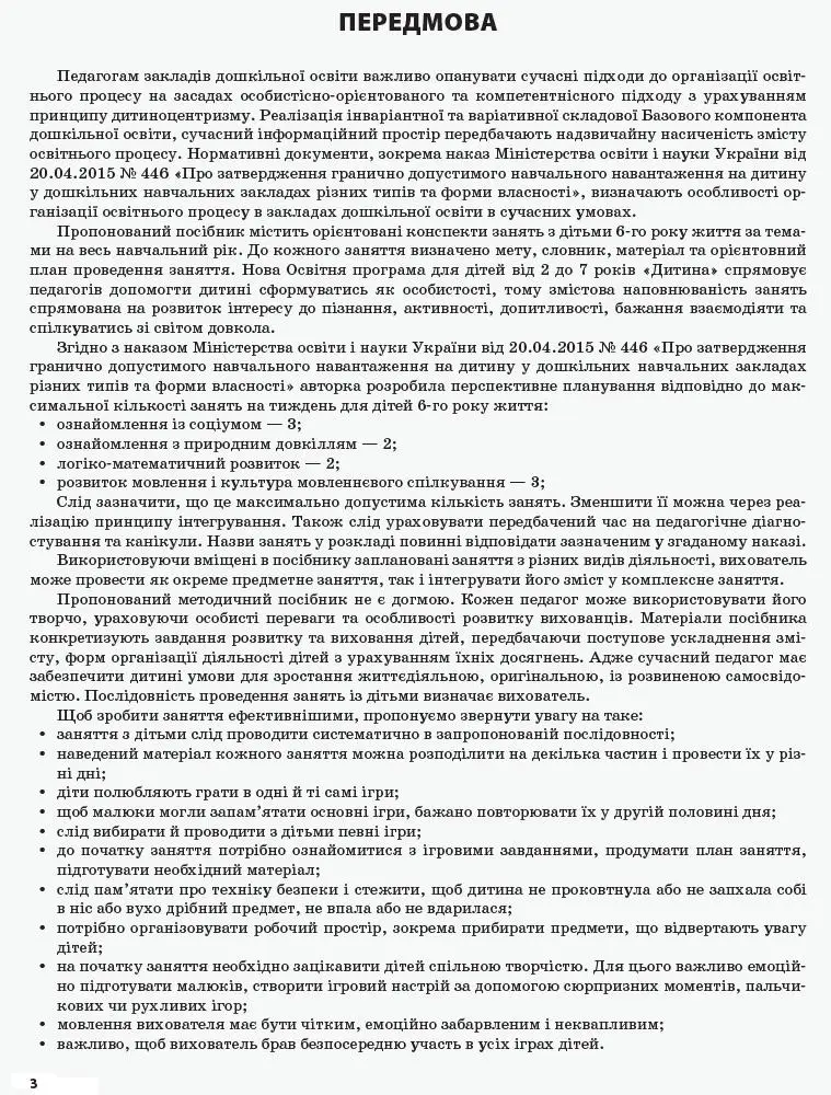 Посібник містить орієнтовні конспекти занять з дітьми 6-го року життя, що реалізують завдання освітніх ліній «Дитина в соціумі», «Дитина у природному довкіллі», «Дитина у світі культури», «Дитина в сенсорно-пізнавальному просторі», «Мовлення дитини». Конспекти занять складено на навчальний рік (за порами року) відповідно до вимог та завдань оновленої програми розвитку дитини дошкільного віку «Дитина». Задля зручності використання всі розробки розміщено на окремих аркушах. Береги для записів да дуть творчому вихователеві змогу, користуючись запропонованим у посібнику матеріалом, скласти власні конспекти занять.