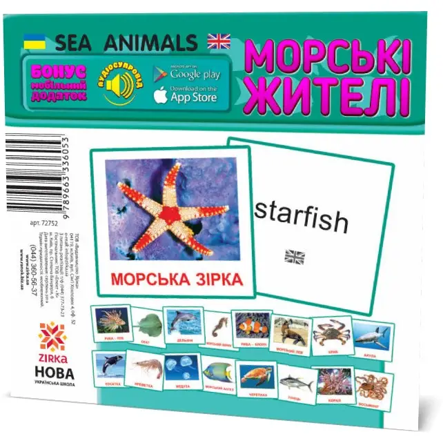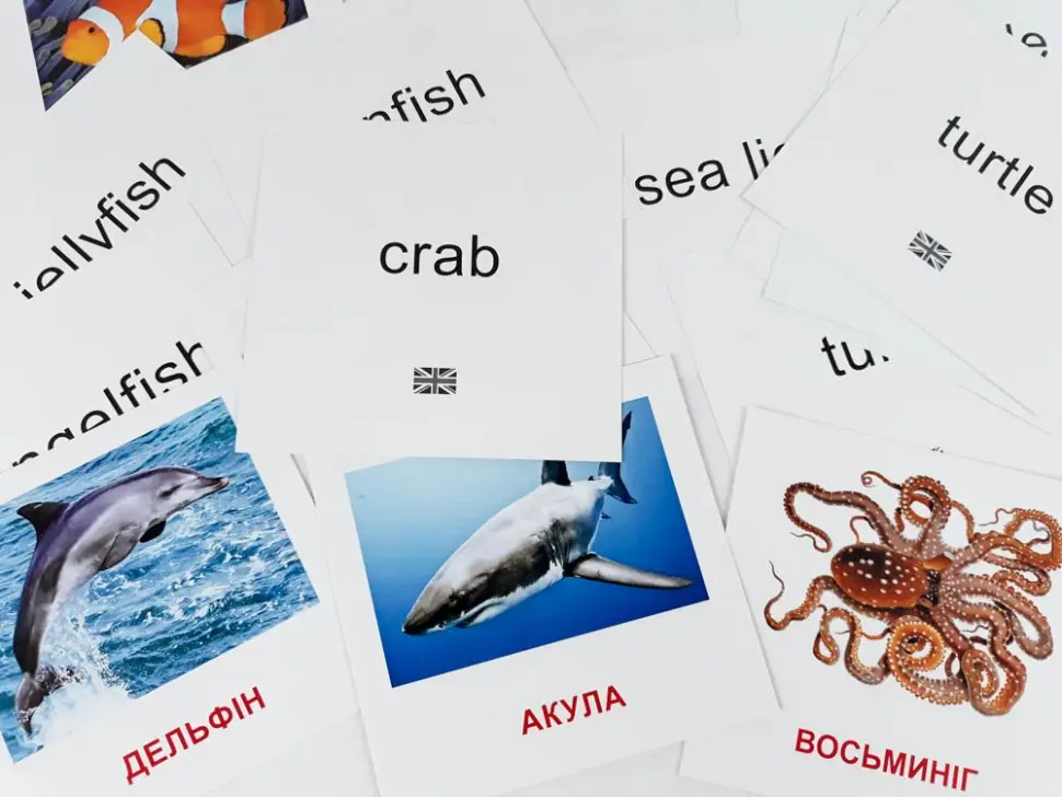 Тематичні картонні картки із зображенням морських тварин та їх назв для всіх вивчаючих англійську мову. За допомогою додатку можна почути, як вимовляються назви зображених об’єктів українською та англійською мовами.