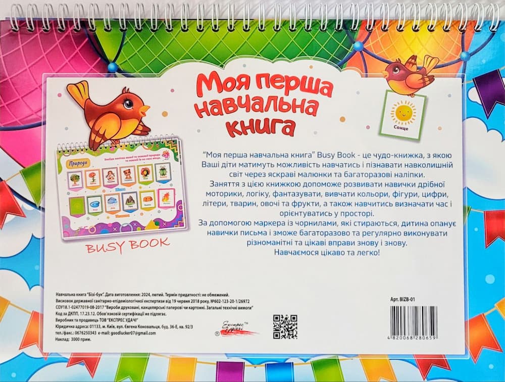 “Моя перша навчальна книга” Busy Вook- це чудо-книжка, з якою Ваші діти матимуть можливість навчатись і пізнавати навколишній світ через яскраві малюнки та багаторазові наліпки. Заняття з цією книжкою допоможе розвивати навички дрібної моторики, логіку, фантазувати, вивчати кольори, фігури, цифри