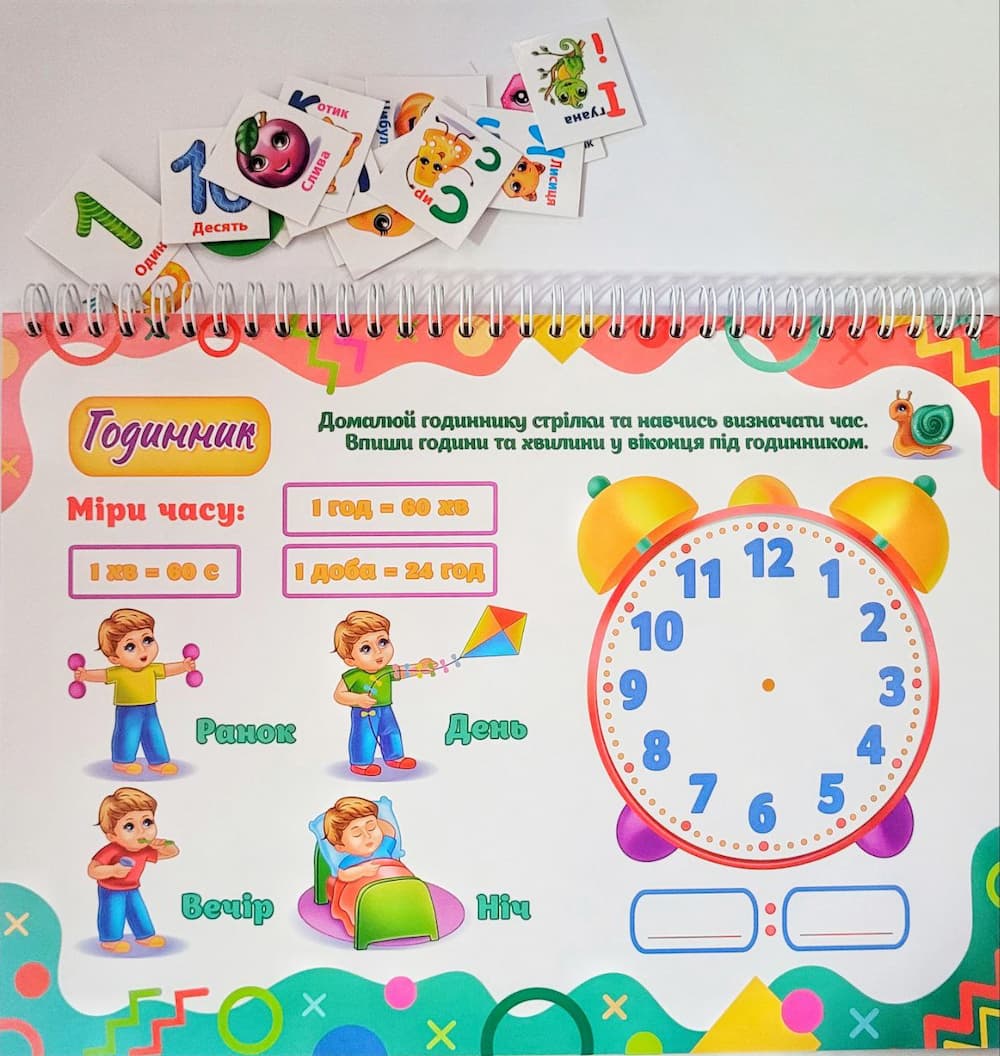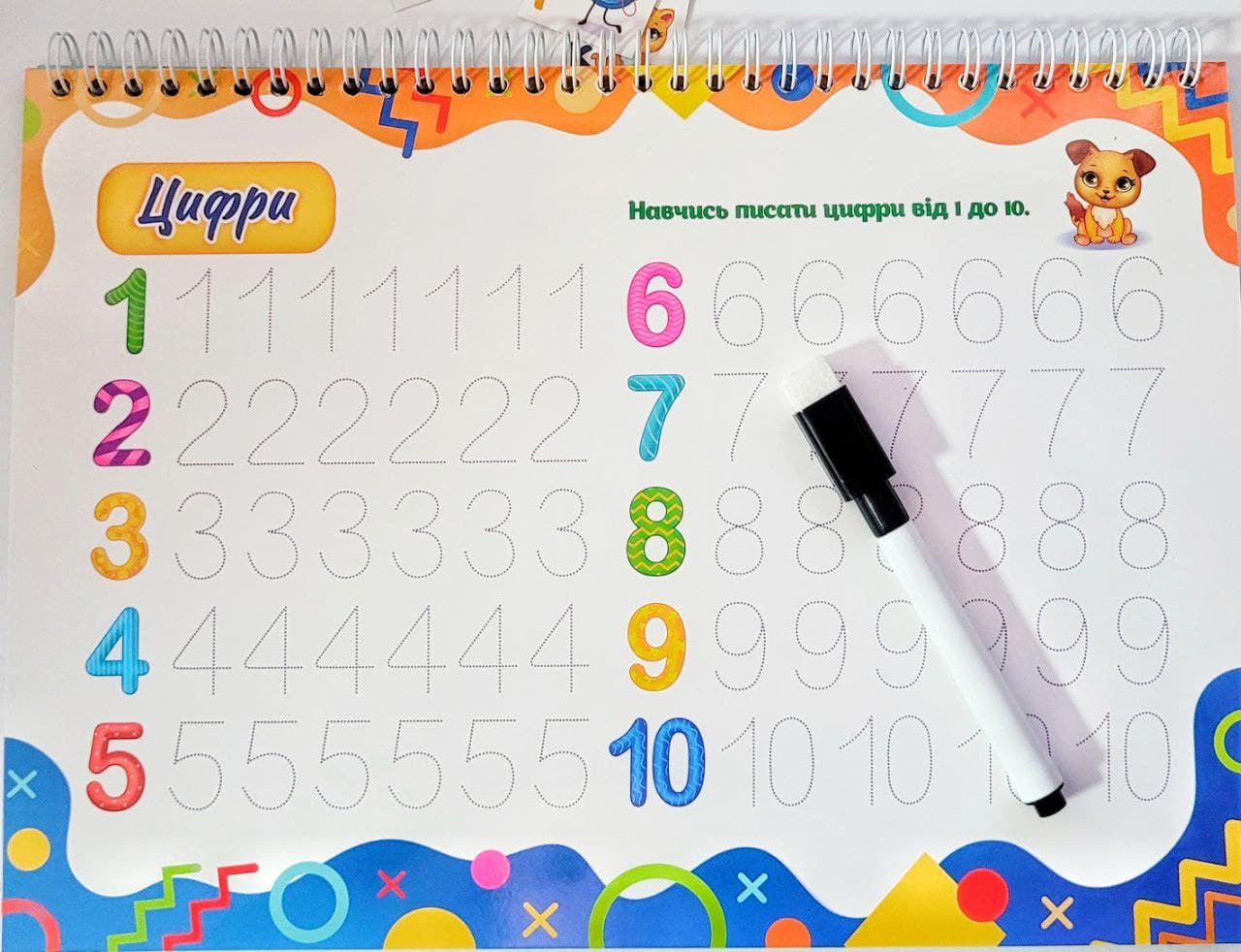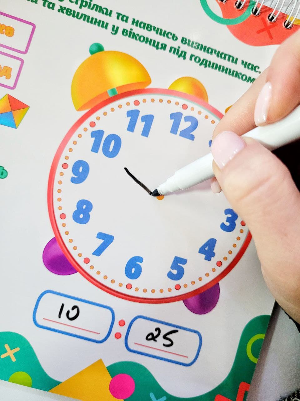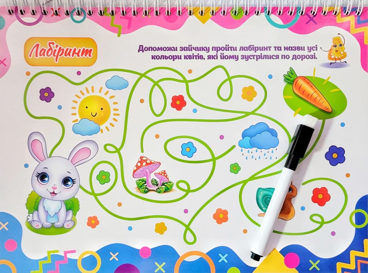 літери, тварин, овочі та фрукти, а також навчитись визначати час і орієнтуватись у просторі. За допомогою маркера із чорнилами, які стираються, дитина опанує