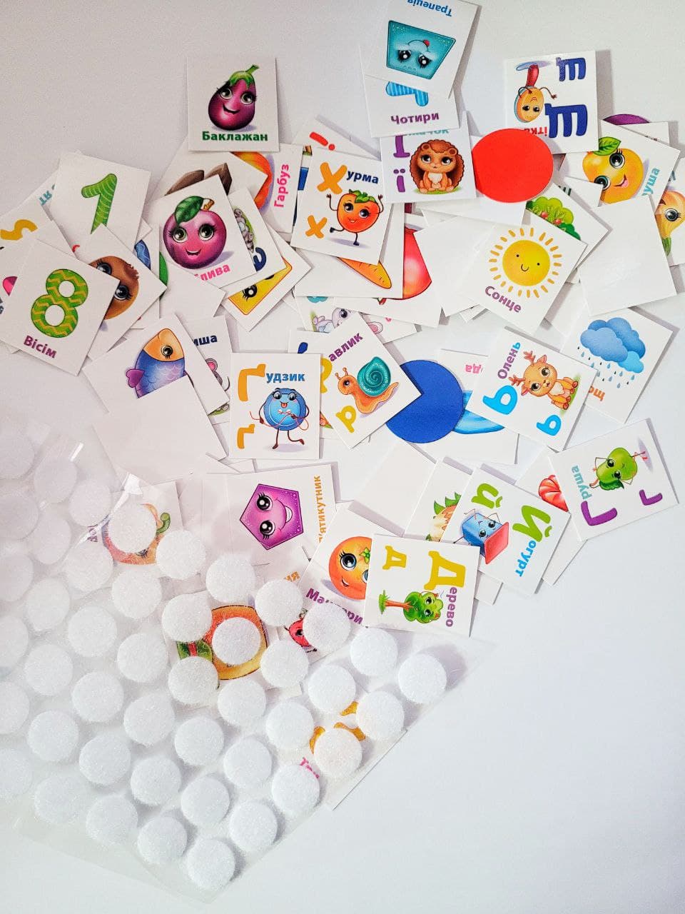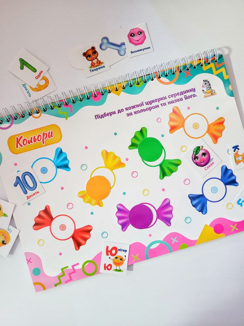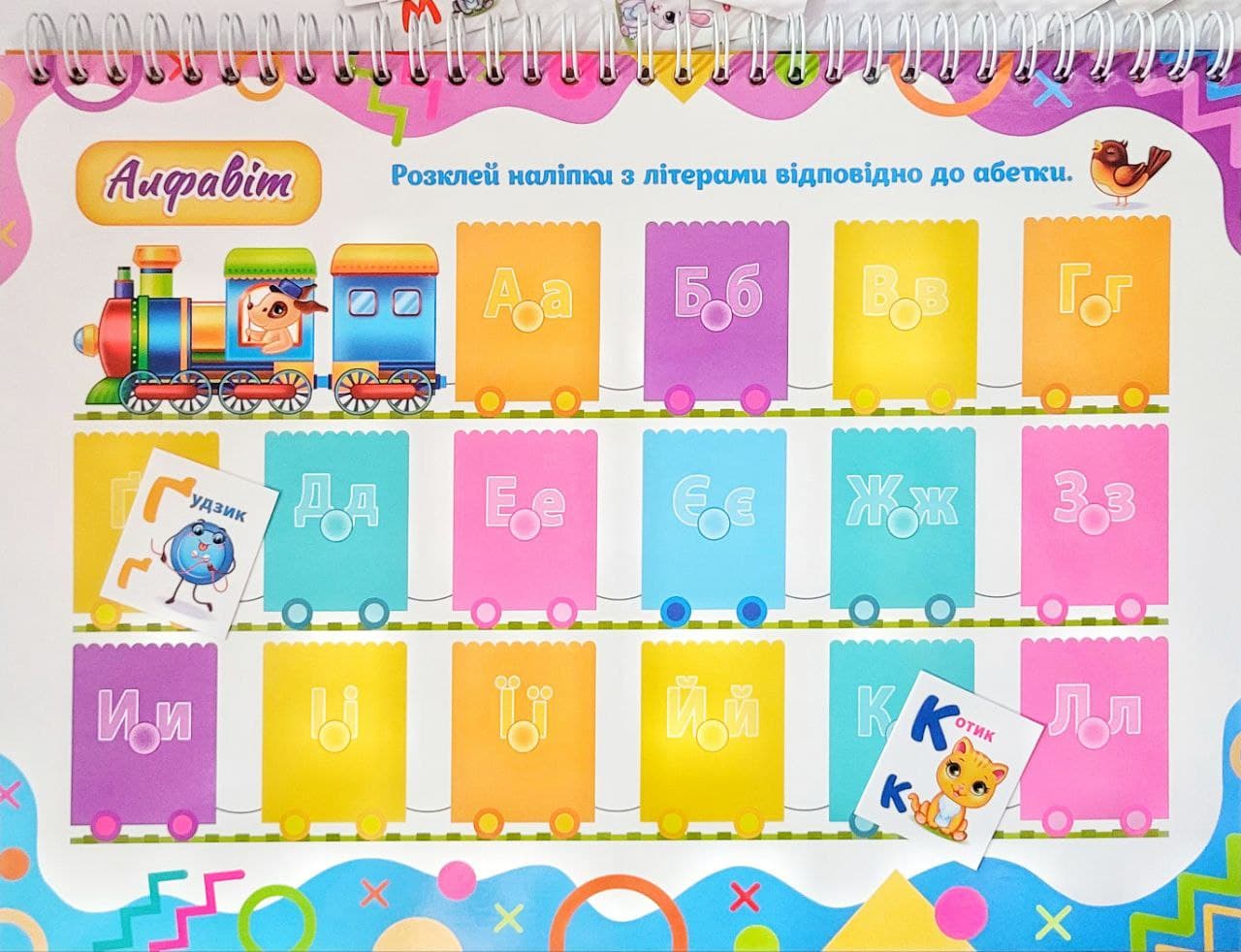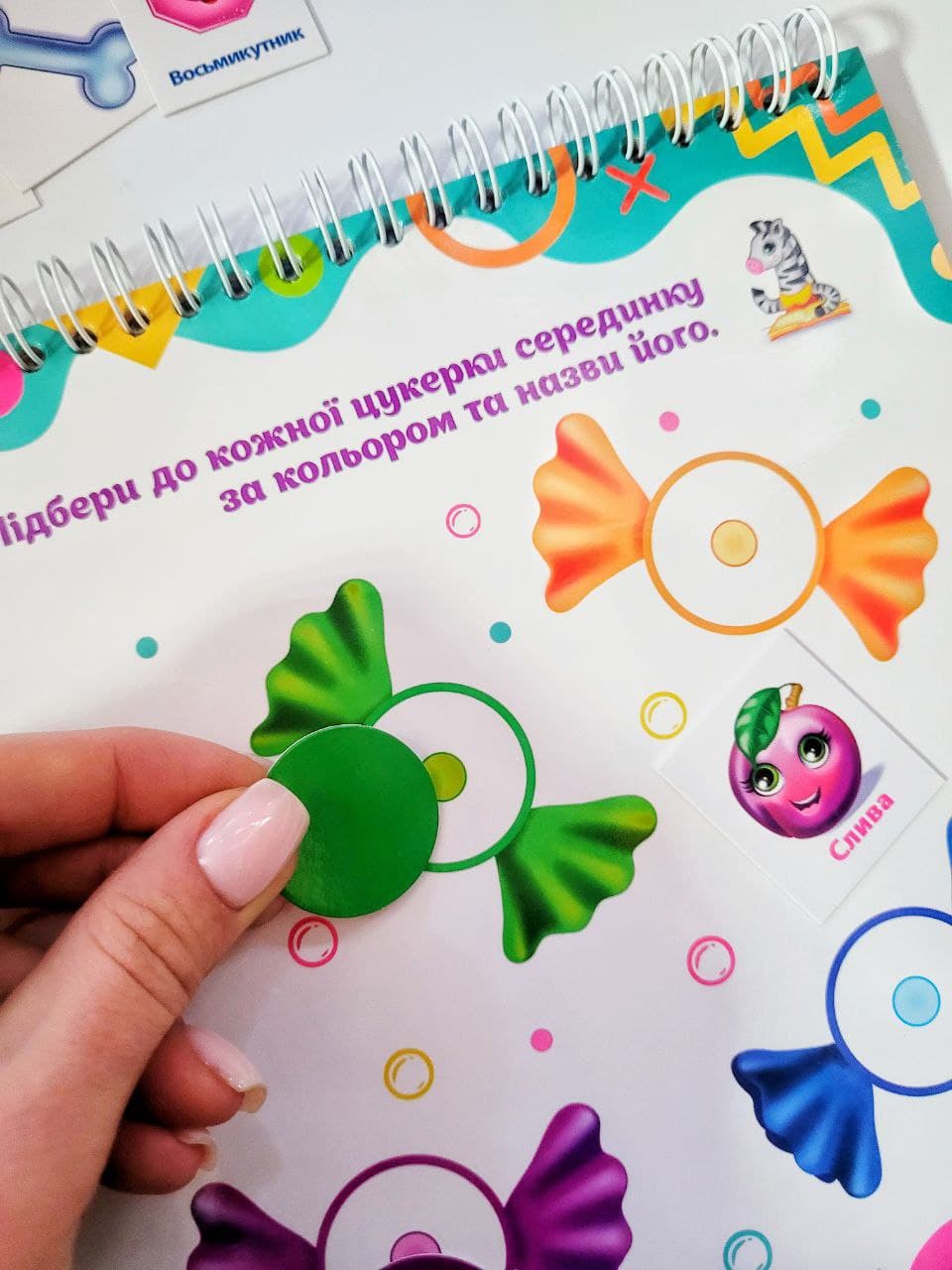 літери, тварин, овочі та фрукти, а також навчитись визначати час і орієнтуватись у просторі. За допомогою маркера із чорнилами, які стираються, дитина опанує