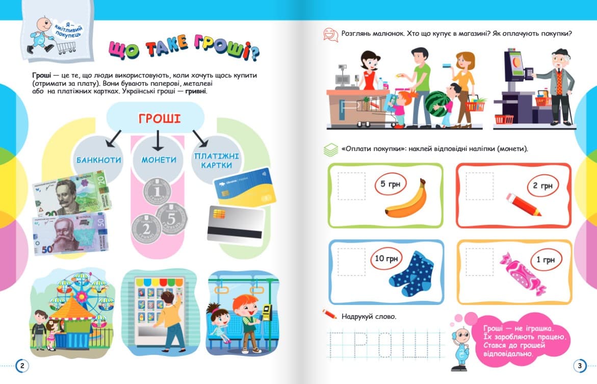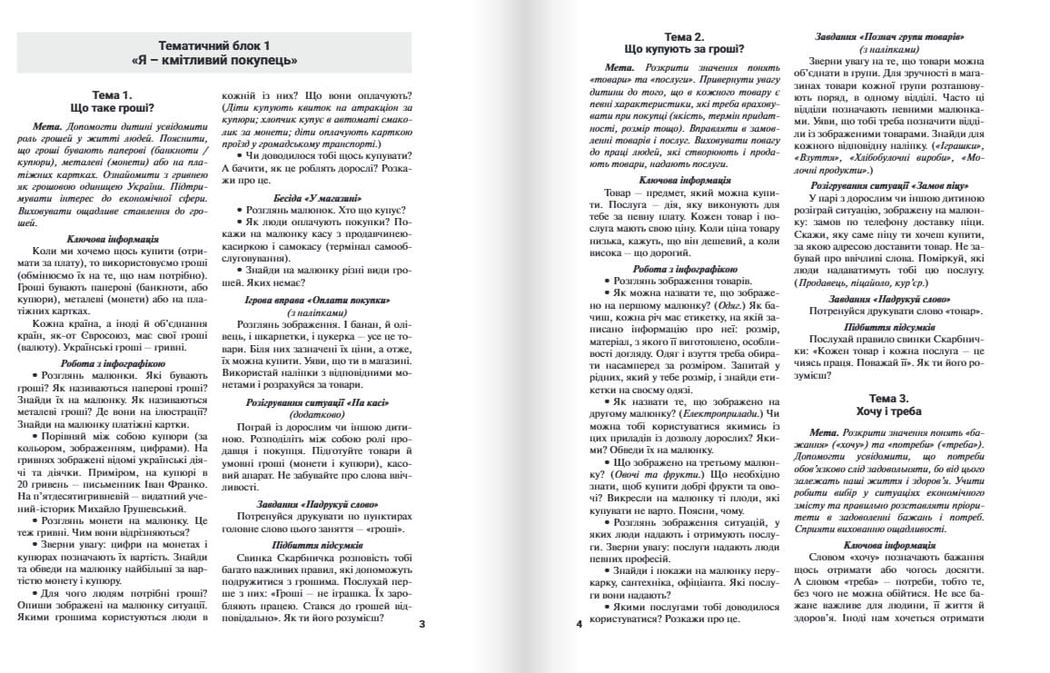 Навчально-методичний посібник (32 с.) із методичними порадами (16 с.) та наліпками спрямований на формування основ фінансової грамотності в дітей старшого дошкільного віку, ознайомлення їх із базовими економічними поняттями та набуття ними первинного досвіду дій із грішми.