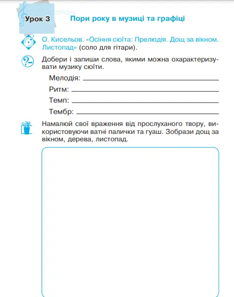 Зошит має на меті допомогти учням засвоїти програмовий матеріал, навчити сприймати, розуміти, імпровізувати і любити музику як мистецтво, а також стимулювати творчу діяльність дітей на уроках. Зошит відповідає Державному стандарту початкової освіти, Типовим освітнім програмам та підручнику «Мистецтво. 4 клас» (автор Л. Г. Кондратова). Для учнів 4-го класу, вчителів, батьків.