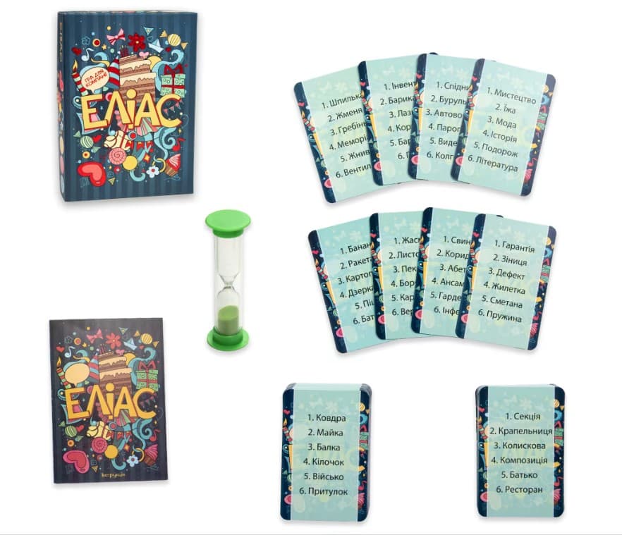 Настільна гра “Еліас” – це швидка та цікава гра для компанії, яка тестує ваші здібності пояснення ігрових слів без використання спільнокореневих слів.