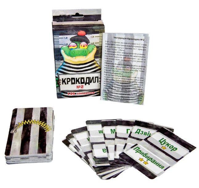 «Крокодил №2» – це всім відома гра з новими завданнями. У ній 72 картки та 144 слова, з яких на ваш вибір слова двох рівнів складності. Грайте невеликою компанією доки в вас не закінчаться картки та можете починати заново.
