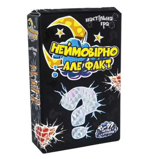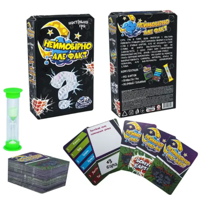 «Неймовірно але факт» настільна карткова гра, яка зацікавить будь-кого. Ваша основна задача пояснювати слова. Але головна умова в тому, що пояснюючи не можна вживати однокореневі слова. Так само в грі є бонусні картки, які містять в собі додаткові умови, яких варто дотримуватися під час свого ходу. Дотримання умов принесе вам додаткові бали, але не варто розслаблятися адже штрафи теж передбачені! Слова на картках абсолютно різні і розбиті на три рівні складності, можуть бути і супергерої, і актори, і предмети побуту. Переможе в грі той, хто заробить якомога більше балів.