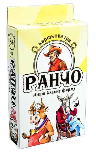 «Ранчо» – карткова гра для дітей, яка буде цікава всій родині. Задачею гравців є зібрати картки з різними домашніми тваринами, вміло обмінюючи їх на «ринку». В обміні беруть участь тільки картки домашніх тварин, а їхня «ціна» визначається балами на зображеннях. Щоб взяти картку з «ринку» натомість потрібно з рук викласти картки, у яких сума або різниця балів дорівнює балам на картці з «ринку». І виграє той, хто до кінця гри збере найбільше ранчо. «Ранчо» вдало поєднує навчання з веселощами, адже граючи діти швидше починають розуміти, як додавати і віднімати числа в умі. Вік: 8+ Гравців: 2-6 Комплектація: 72 картки, інструкція.