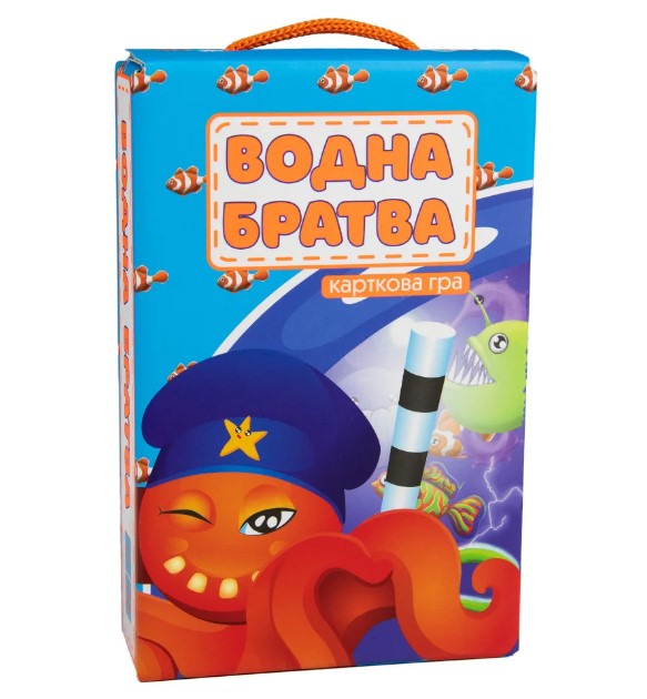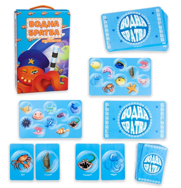 Водна братва – карткова гра, яка розвиває пам’ять та концентрацію. Кожен бере 5 маленьких карток iз зображенням водних жителів. Ведучий на 10 секунд показує малюнок великої карти. Всі намагаються запам’ятати більше риб з цієї карти, щоб потім викласти їх зі своїх. Можна використати козир – офіцера-восьминога.