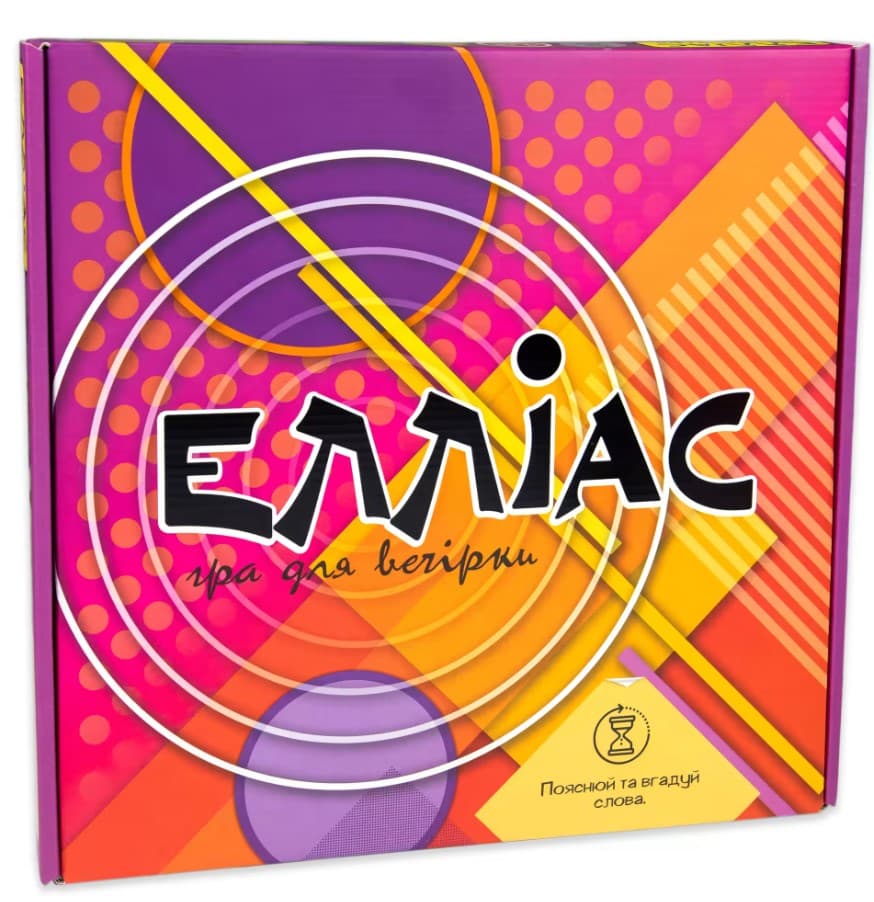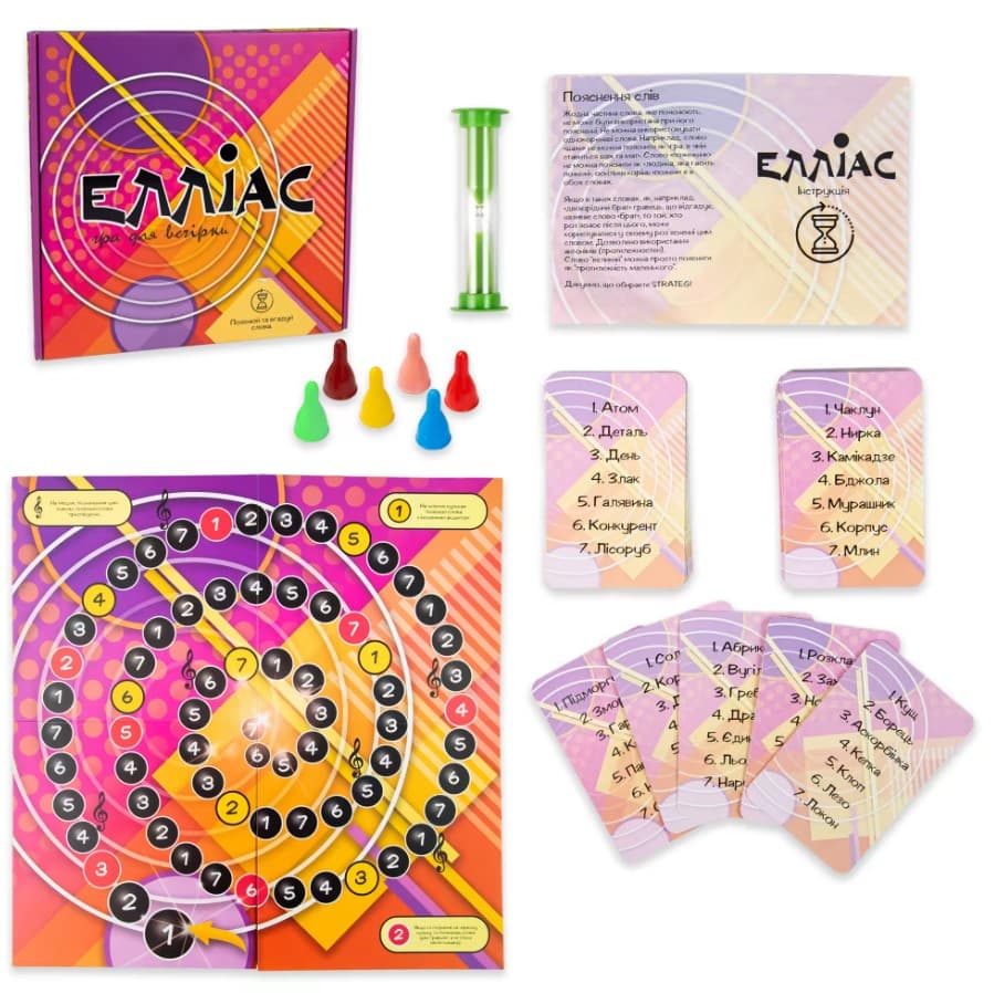 “Елліас” – захоплива командна гра, створена спеціально для компаній. У грі вас чекає 165 карток із різноманітними словами, а також цікаве поле з завданнями, які обіцяють веселі та цікаві моменти.