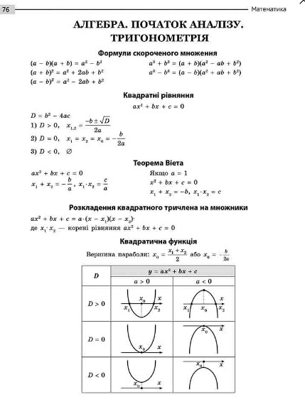 Посібник містить тільки найнеобхідніші теоретичні відомості з усіх тем, які перевіряють на НМТ з української мови та математики.