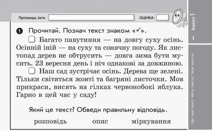 Відривні картки призначені для організації самостійної роботи здобувачів освіти на уроках, мета якої — перевірити засвоєння вивченого матеріалу. Завдання дібрані таким чином, аби на їх виконання учні витрачали не більше 7–10 хвилин. Третьокласники мають можливість здійснити самооцінку, домалювавши казковому персонажу — Соняшнику, відповідний вираз «обличчя».