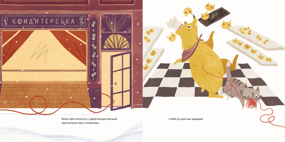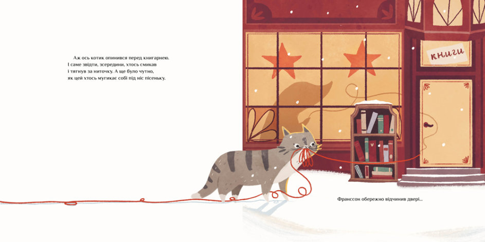 Маленький котик живе в картонній коробці. Щоб не так мерзнути взимку, він цілий день гуляє містечком. А ще його зігріває червоний вовняний светр. Якось, гуляючи напередодні Різдва, котик не помітив, що на светрі висмикнулася петелька і за ним тяглася ниточка, аж доки розпустився весь светр… Що ж тепер робити? Невже котик мерзнутиме і ніхто йому не допоможе?
