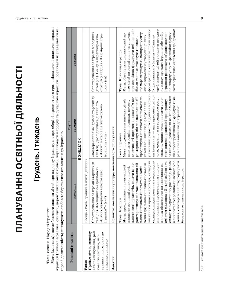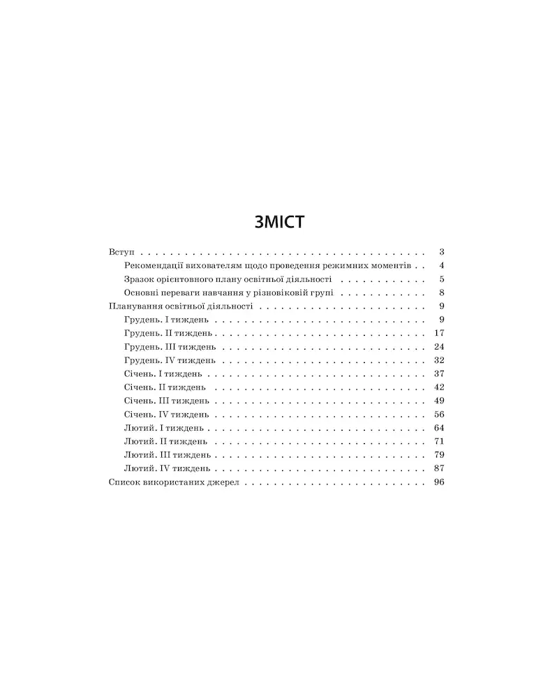 Посібник містить орієнтовне перспективне календарне планування освітньої роботи з дітьми у різновіковій групі дитячого садка. Теми занять складено на навчальний рік (за порами року) відповідно до вимог та завдань Базового компонента дошкільної освіти. У темах та меті занять реалізовано освітні лінії: • “Особистість дитини”; • “Дитина в соціумі”; • “Дитина у природному довкіллі”; • “Дитина у світі культури”; • “Гра дитини”; • “Дитина в сенсорно-пізнавальному просторі”; • “Мовлення дитини”. Дл я педагогічних працівників закладів дошкільної освіти, які працюють у різновіковій групі.