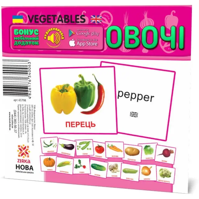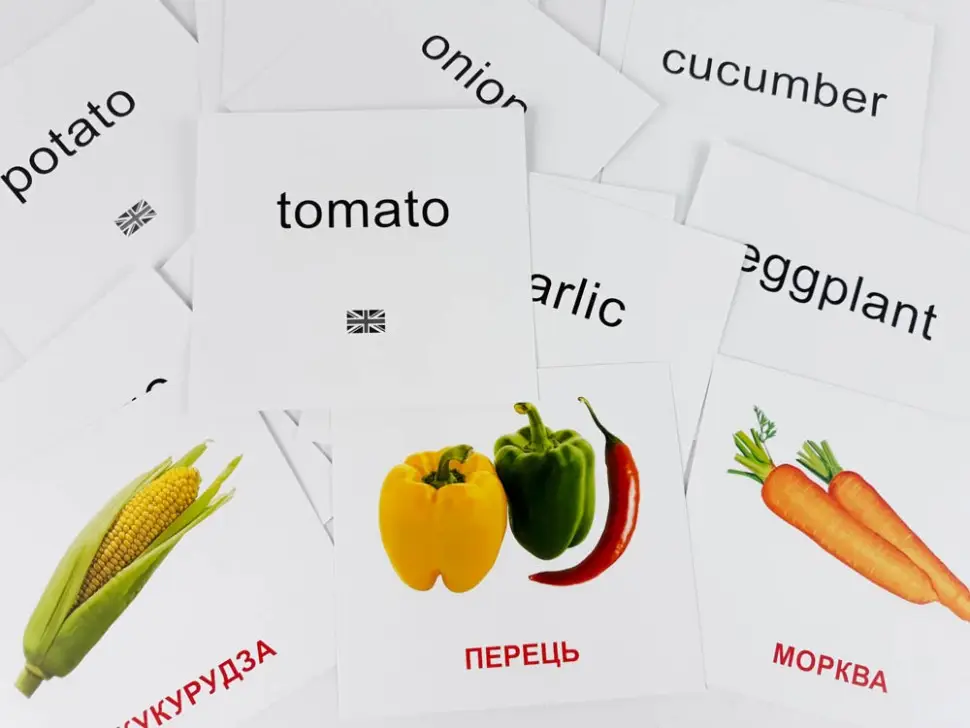 Тематичний комплект картонних карток із зображенням овочів та їх назв для всіх, хто вивчає англійську мову. За допомогою додатку можна почути, як вимовляються назви зображених об’єктів українською та англійською мовами.