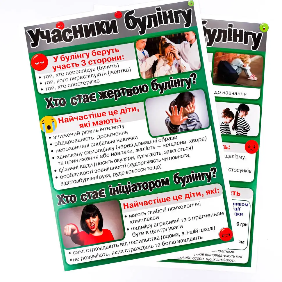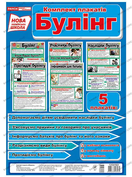 Що таке «Булінг»? Це агресивна свідома поведінка дитини або групи дітей стосовно іншої, що супроводжується регулярним психологічним тиском. Найбільш поширене це явище в шкільних навчальних закладах. Які причини, наслідки і як цьому запобігти? Відповіді на ці питання знаходимо в комплекті плакатів про булінг. Використовуємо плакати на виховних годинах чи розміщуємо для інформативності в класі. Під час занять допомагаємо дітям усвідомити наслідки булінгу та навчаємо їх, як правильно протидіяти цьому.