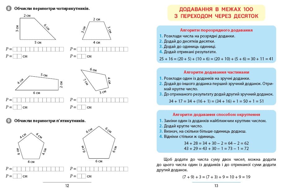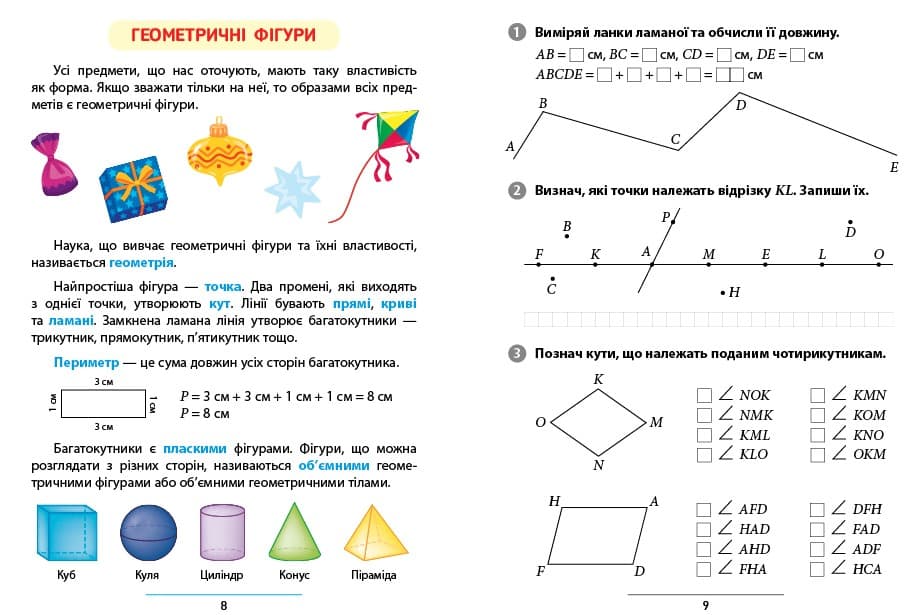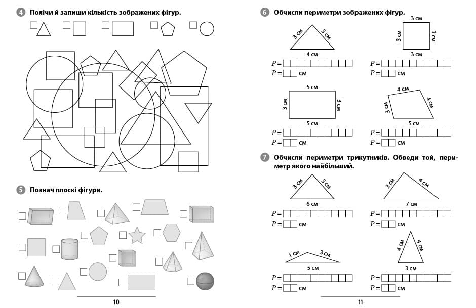 На сторінках цього посібника розміщено завдання, виконуючи які дитина закріпить знання про властивості геометричних фігур і навчиться знаходити їхній периметр, повторить математичні дії множення і ділення та повправляється виконувати їх, удосконалить уміння додавати й віднімати в межах 20 і в межах 100, попрактикується розв’язувати різноманітні задачі. Посібник побудовано з урахуванням дитиноцентризму, доступності й практичної спрямованості змісту. Видання відповідає Типовим освітнім програмам НУШ і стане в пригоді як додатковий тренажер на уроках, а також буде корисним для занять удома самостійно та з батьками. Книжка містить розмаїті завдання, що розвиватимуть уяву, мислення і дрібну моторику, стимулюватимуть зацікавленість дитини в навчанні.