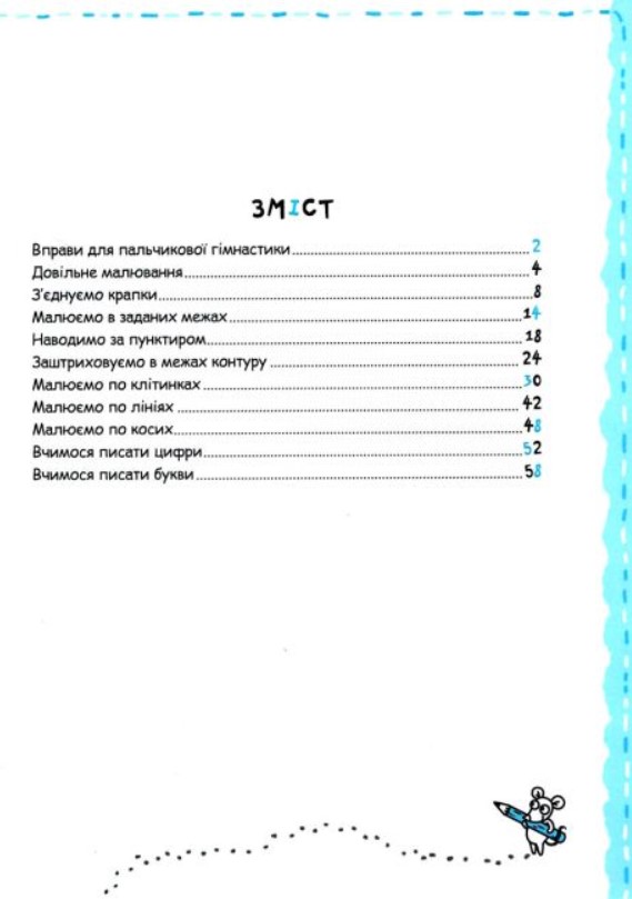 Унікальний за змістом і методичним наповненням робочий зошит — стильний та сучасний, зроблений з любов’ю та знанням своєї справи провідними вітчизняними фахівцями. Зошит має на меті допомогти підготувати руку дитини шостого-сьомого року життя до оволодіння письмом у школі під час індивідуальних та групових занять. Завдання посібника сучасні, цікаві, доступні, актуальні, скомпоновані за принципами цілісності, системності, послідовності, поступового ускладнення, закріплення та повторення матеріалу. Зошит укладено за чинним Базовим компонентом дошкільної освіти та програмами розвитку дитини. До завдань із навчання письма входить матеріал із математики та логіки, суспільствознавства, природознавства, розвитку мовлення тощо. Герої зошита, котик та мишеня, перетворять заняття на веселу й цікаву гру.